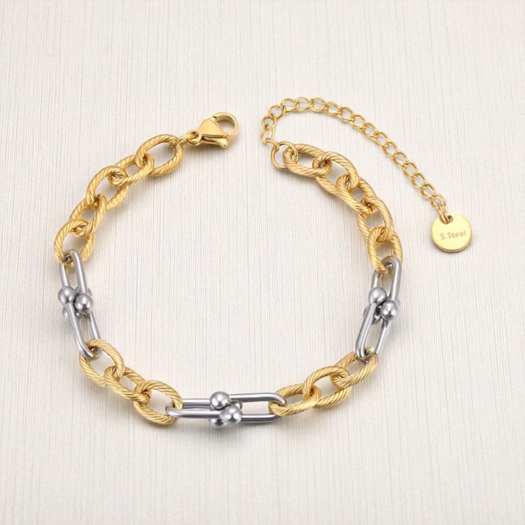 Crafted from durable stainless steel, it features a unique mix of twisted rope-style gold links paired with sleek silver hardware accents for a modern contrast.