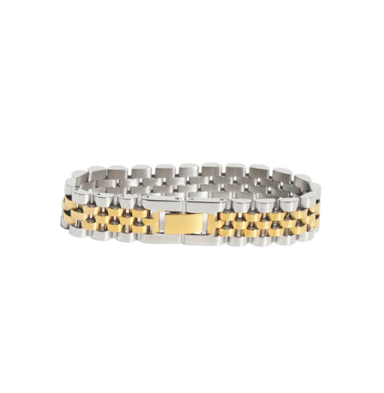 Do it with our gold and silver chunky watch band bracelet. This is a great layering piece to blend gold and silver jewellery or worn on its own as a statement piece in bi-metal steel.