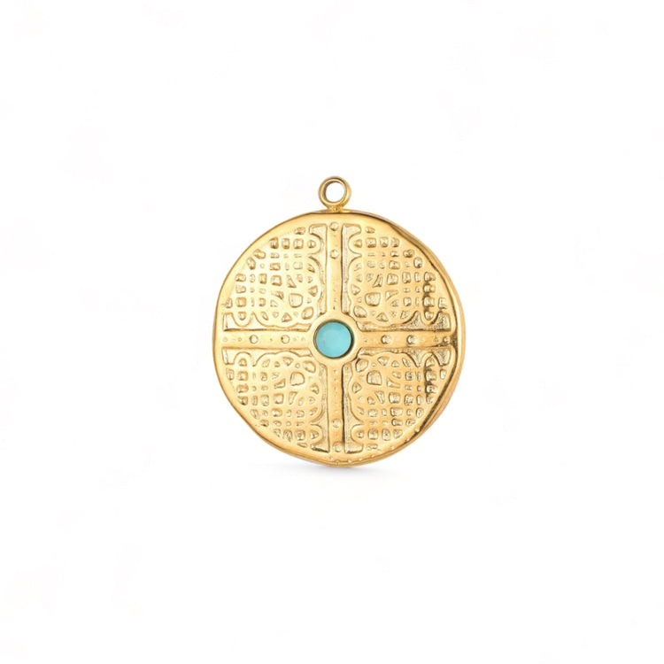 It is gold plated stainless steel with a centre turquoise coloured stone.