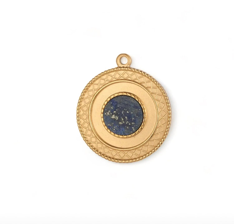 Messina is a coin shaped charm with a two borders which surround a dark blue coloured stone in the centre.