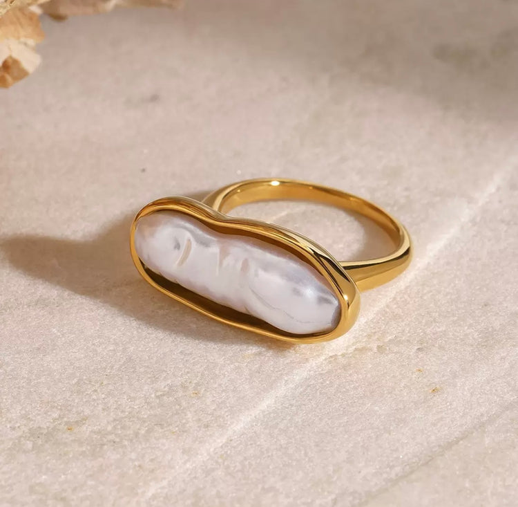 The combination of the warm gold and the luminous pearl creates a sophisticated yet modern aesthetic, making this ring a statement piece perfect for both casual and formal wear.