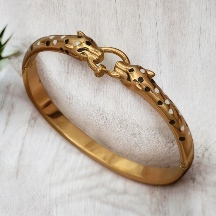 The bracelet's smooth, polished band contrasts beautifully making it a bold yet refined accessory, perfect for those who appreciate luxury and style with a touch of the wild.