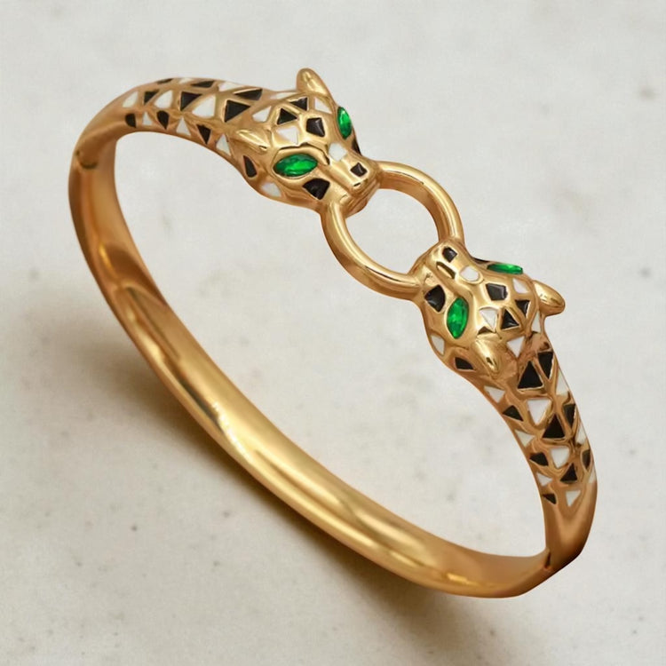 Bold, elegant, and fiercely unique — this gold-toned bangle features two intricately sculpted panther heads meeting at a central ring, symbolising strength and connection.