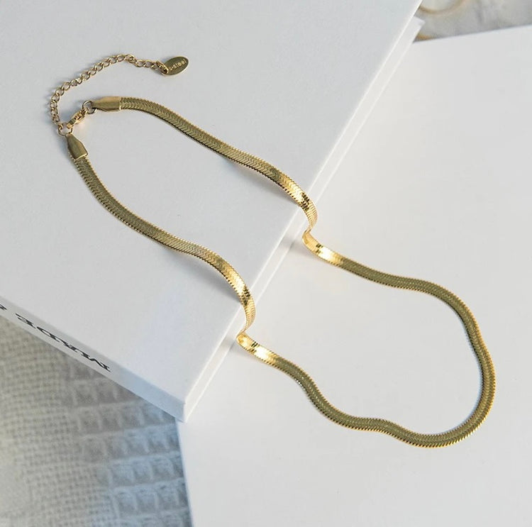 This flat herringbone chain gracefully captures every glimmer of light. Whether worn alone or layered, its timeless charm speaks volumes. Is there really anything more to add?