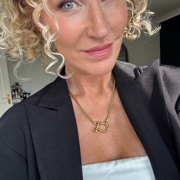 This necklace features a bold and modern design, combining sleek, polished metallic links with a striking central clasp in gold. The clasp, reminiscent of an industrial-inspired shackle, adds a unique, edgy element to the otherwise sophisticated look.