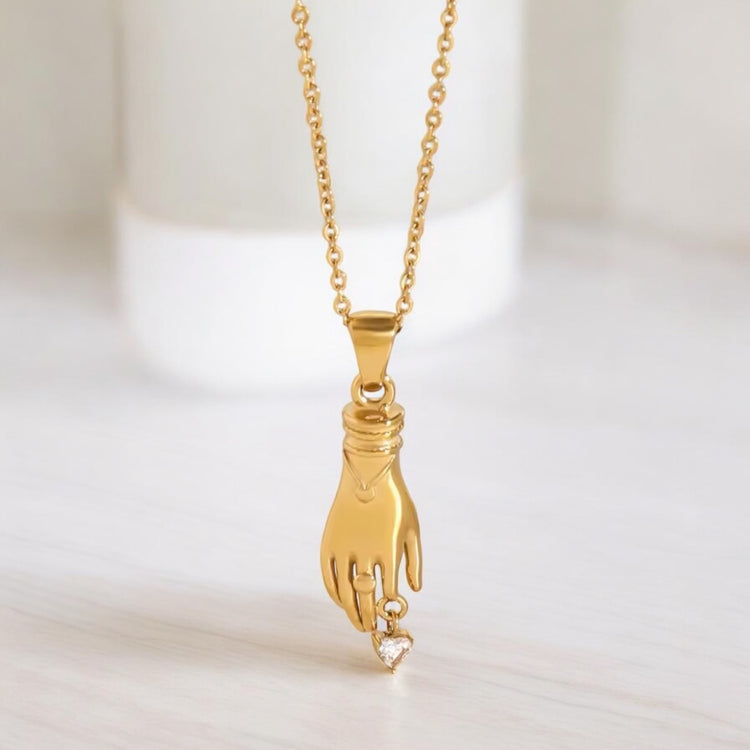 This stunning necklace showcases a unique and artistic design featuring a delicate golden hand pendant gracefully holding a sparkling heart-shaped charm.
