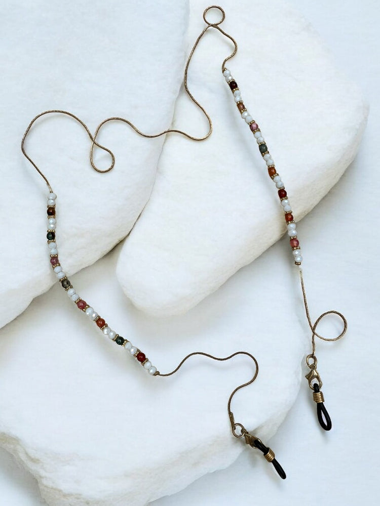 This eye-catching accessory features an array of colorful beads artfully strung along a sleek gold chain, offering a playful yet chic way to keep your sunglasses within easy reach.