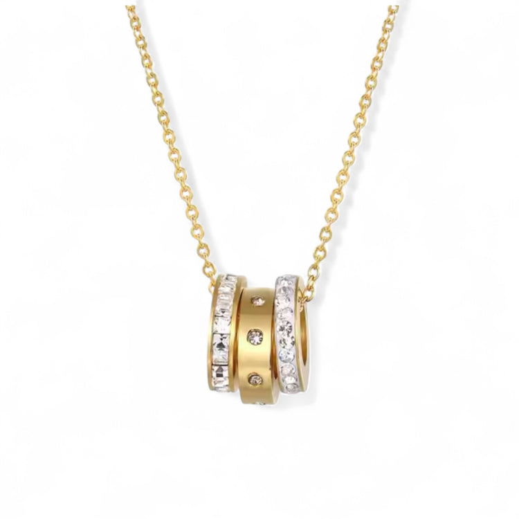 This elegant necklace features a trio of interlocking rings suspended from a delicate gold chain.