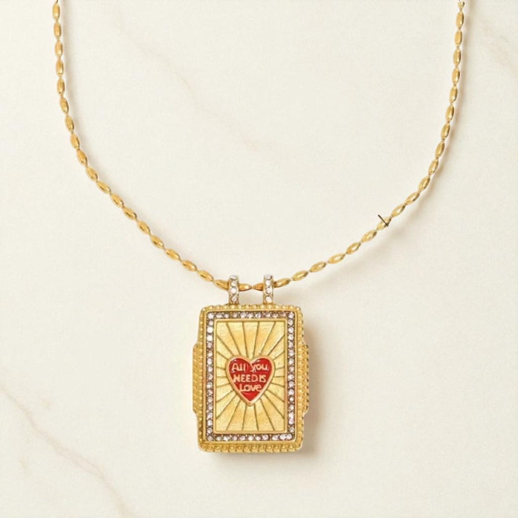 Featuring a rectangular, gold-plated pendant framed with shimmering stones, it showcases a radiant sunburst design with a bold red heart at its centre, inscribed with the words “All You Need Is Love.”