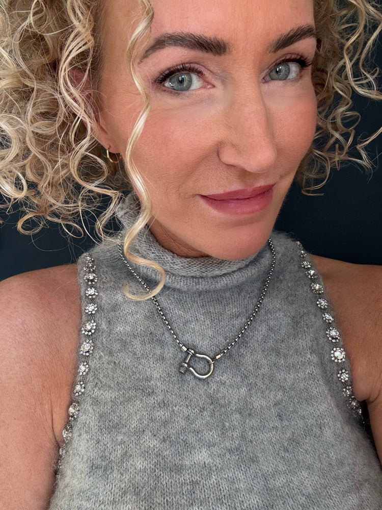 The focal point is a silver shackle-style clasp, giving the piece a contemporary, bold aesthetic.