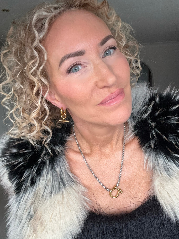 These stunning earrings feature sleek gold plated hoops adorned with a chic T bar charm that hangs elegantly from a circular link.