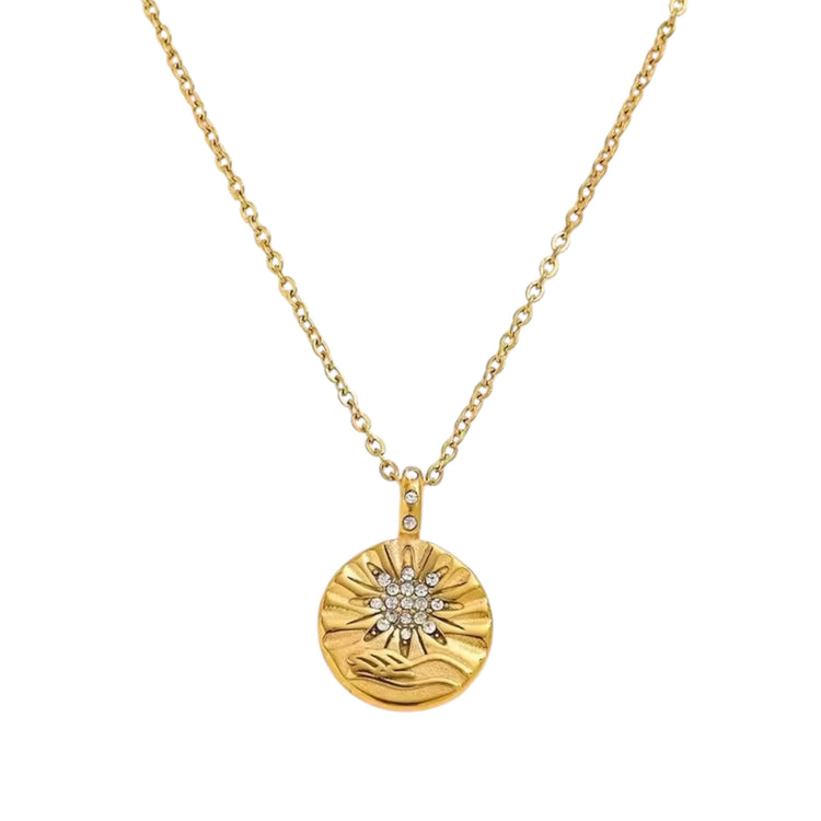 The round pendant (20mm x 14mm) features an engraved sunburst design with sparkling crystal accents at its centre, symbolising light, energy, and new beginnings.