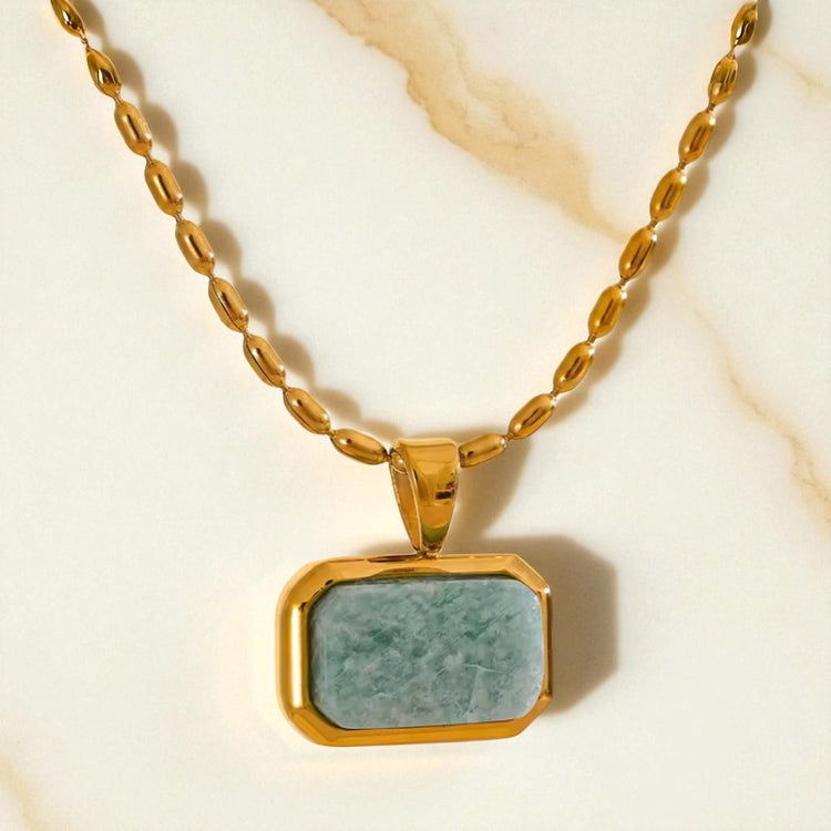 The pendant’s natural green stone brings a soft, organic feel, beautifully contrasted by its sleek gold frame, making it a versatile piece for both casual and dressy outfits.