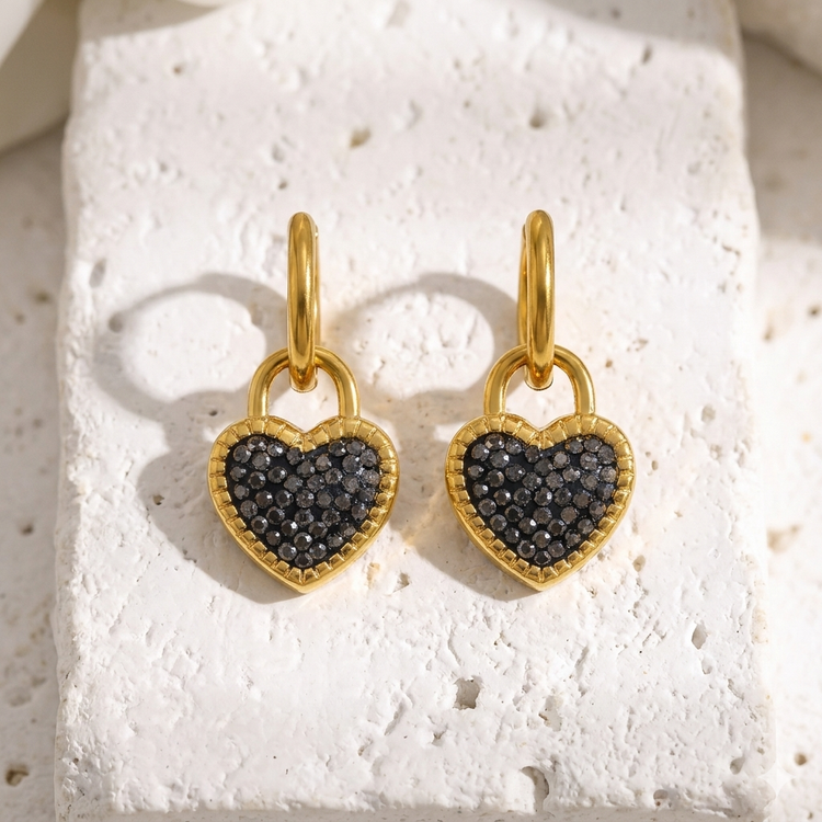 A little romance with a bold edge. These gold huggie earrings feature delicate heart-shaped charms, encrusted with shimmering black stones for a subtle sparkle that catches the light from every angle.
