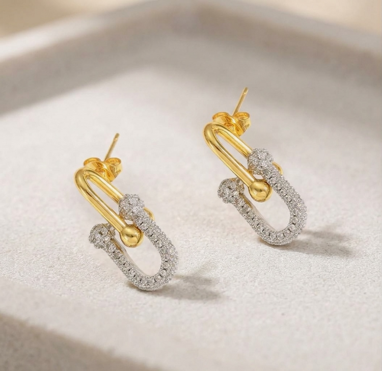 A modern twist on the classic link. These striking earrings feature a polished gold paperclip-style top paired with a sparkling pavé crystal drop, creating the perfect balance of bold and elegant.