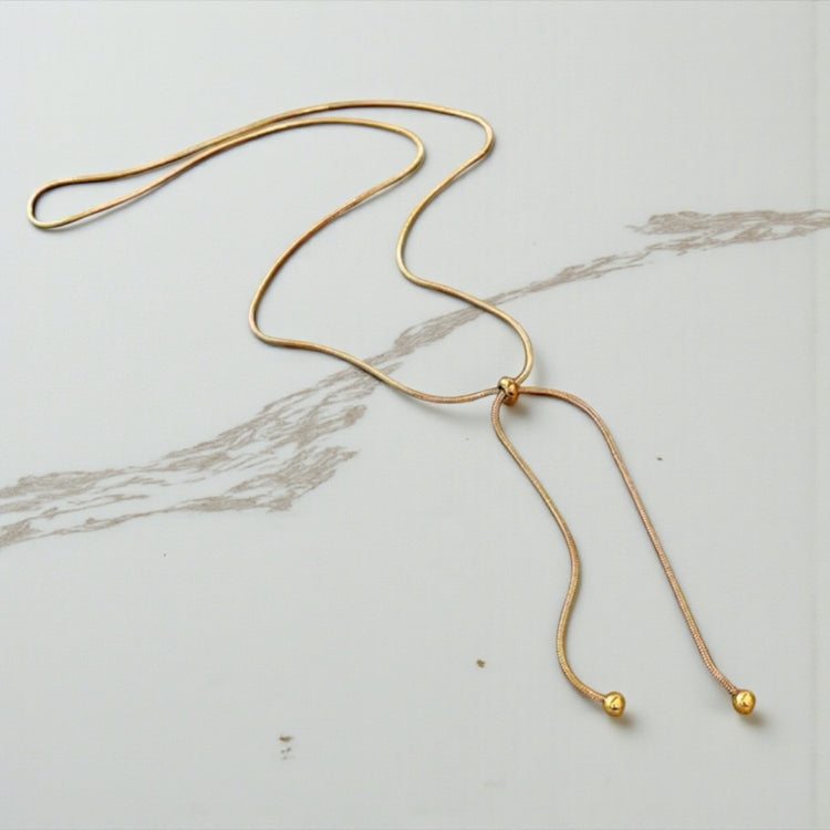 Crafted in a sleek, fluid silhouette, this piece features a polished gold slider that allows you to customise the drop for a perfectly tailored fit. Finished with delicate weighted ends, it drapes beautifully against the skin, catching the light with every movement.