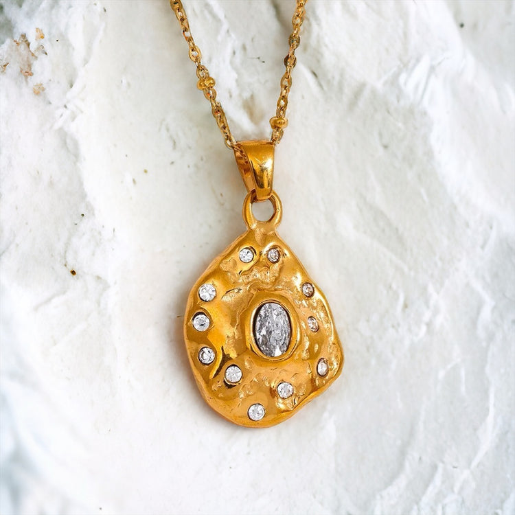 Beautiful hammered gold pendant in an irregular shape, encrusted with stones in various sizes.