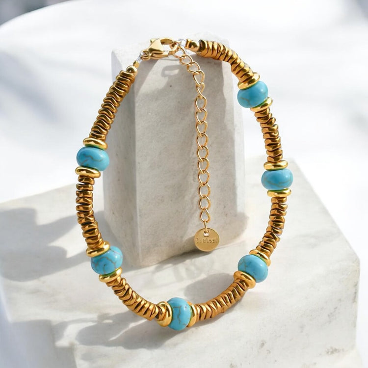 Add a touch of effortless luxury to your look with this striking bracelet, crafted with a rich combination of turquoise and gold-toned elements.