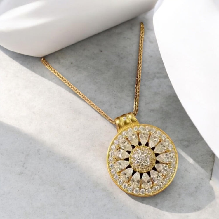 At its centre, a pavé-set cluster of gems adds depth and dimension, evoking the radiant energy of the sun.